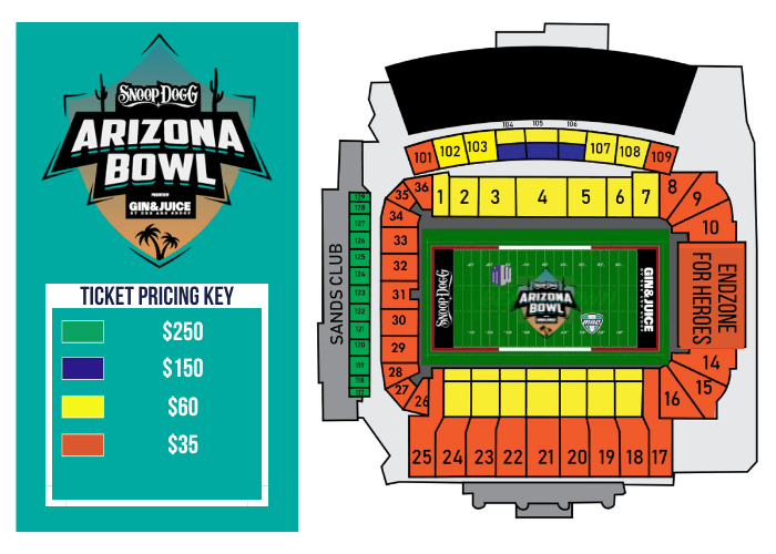 Sands Club tickets are $250 each and inventory is limited. Includes food and soft drinks. Online sales are not available. To purchase Sand Club tickets call 520-AZBOWL1 (520-292-6951) or email Tickets@theArizonaBowl.com.